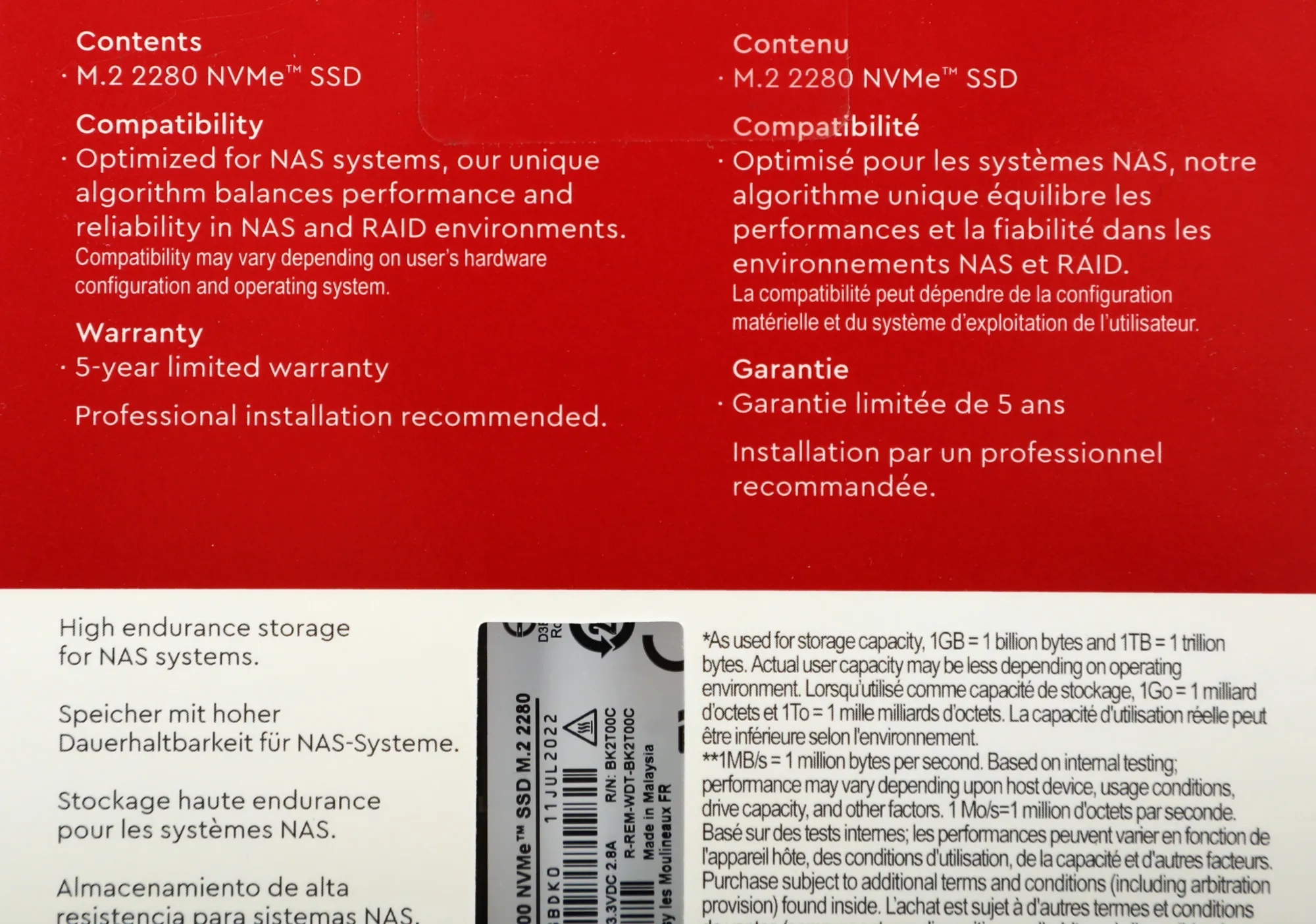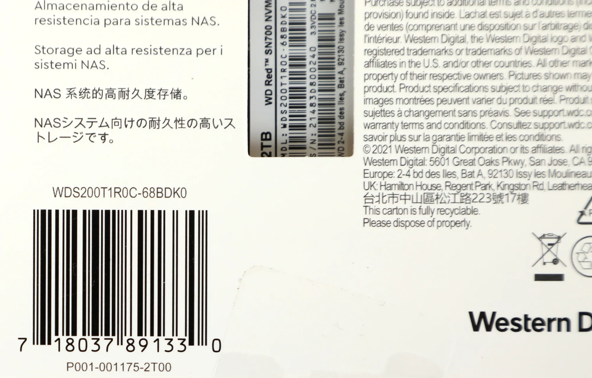Накопитель SSD WD S PCIe 3.0 x4 2TB WDS200T1R0C Red SN700 M.2 2280