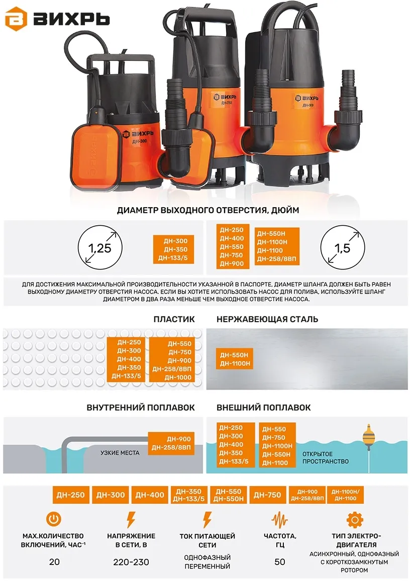 | Конструктивные особенности | поплавковый выключатель, ручка для переноски |