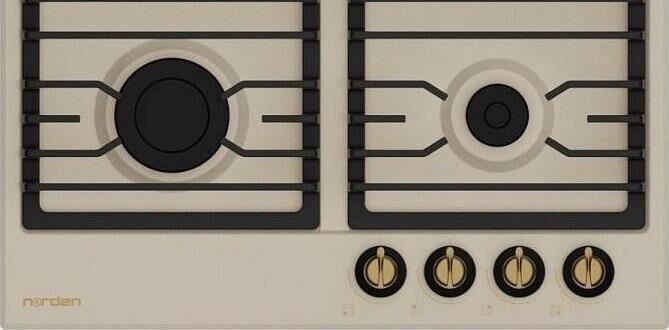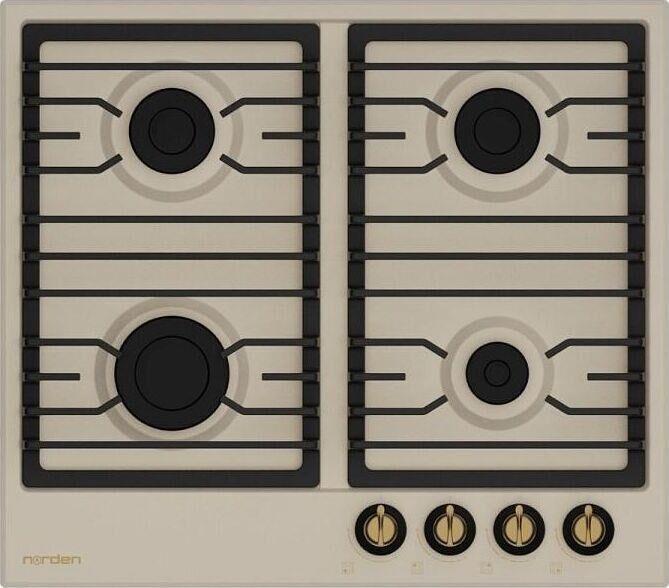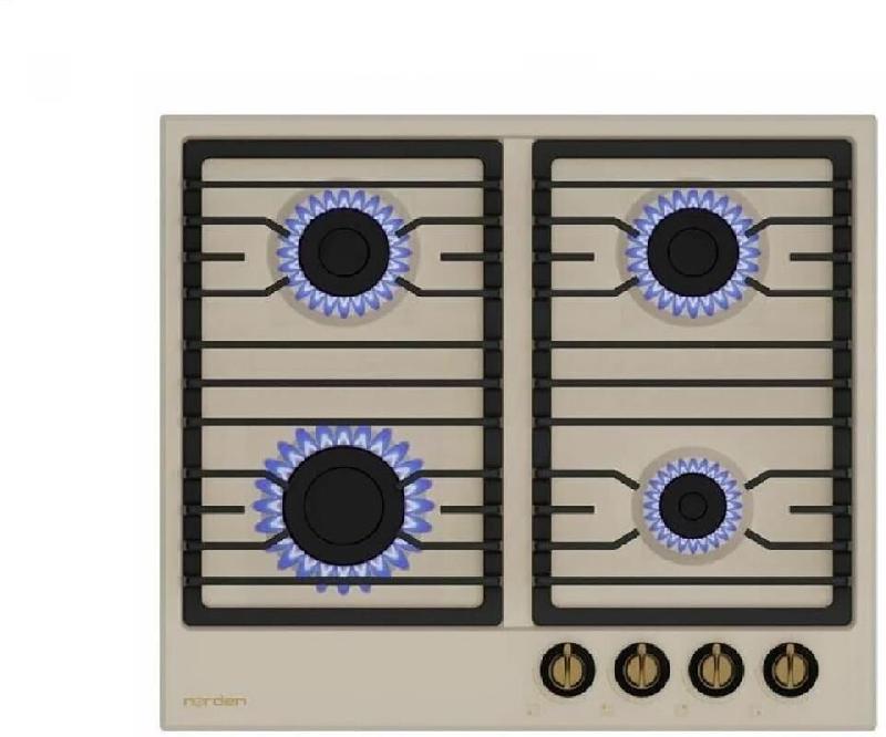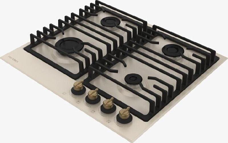 Газовая варочная поверхность 60 см. 4 газовые конфорки. Газ Контроль. Автоподжиг в ручке. Чугунная решетка АНТИК. Ручки управления металл Латунь, жаропрочный пластик Ретро стиль. Шнур, вилка. Эмалированная сталь, цвет Бежевый.