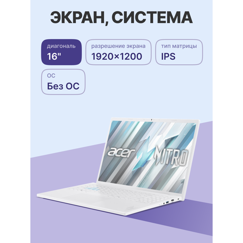 ACER Nitro Lite NL16-71G-568T - это новейшая версия Nitro, которая отличается удивительно тонким и легким дизайном, элегантным жемчужно-белым цветом и мощной конфигурацией.