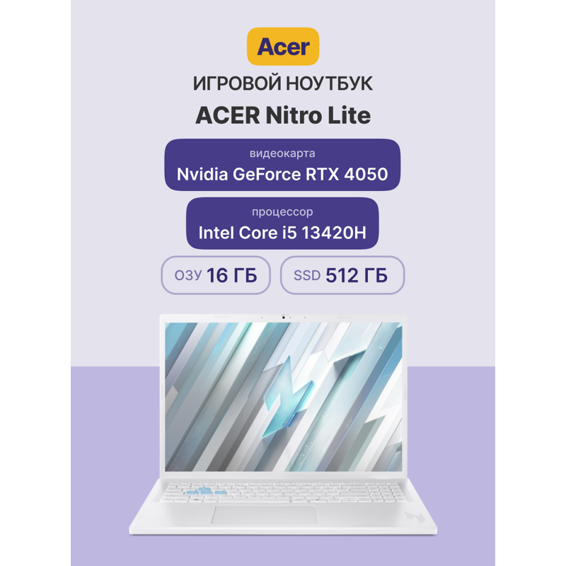 Новая линейка ноутбуков ACER Nitro Lite 16 - это сочетание стильного дизайна и высокой производительности: 16-дюймовый экран с высокой частотой обновления 165 Гц, процессор Intel Core i5 13420H, оперативная память DDR5 и дискретные видеокарты NVIDIA GeForce RTX 4050.