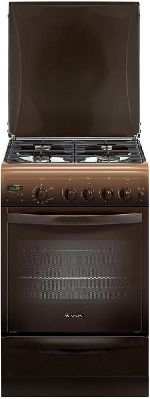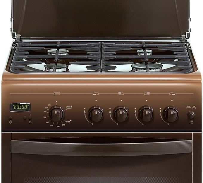 Габариты: 50х58.5х85 см. Полезный объем духовки: 52 л. 4 газ. конфорки. Таймер электронный. Газ-контроль горелок стола и духовки. Электророзжиг горелок стола и духовки. Вертел, Гриль, подсветка.; Цвет коричневый