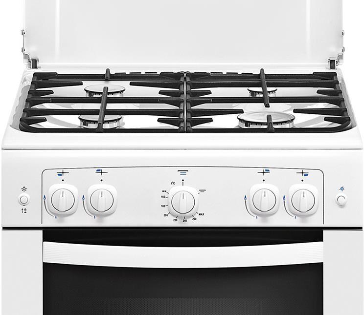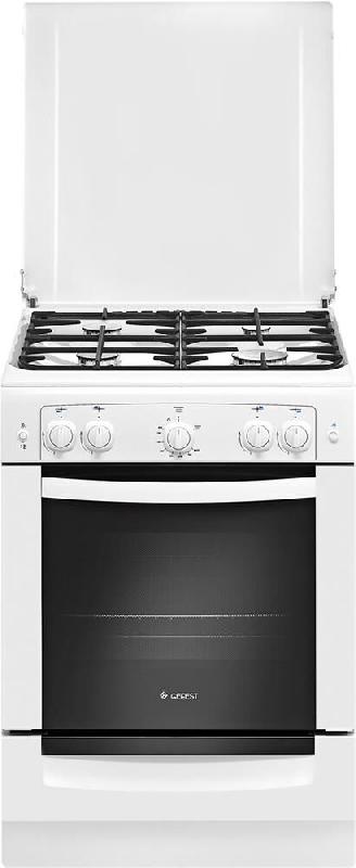 Габаритные размеры: 60х60х85 см. Цвет: белый. Объем духовки 52л. Количество зон приготовления: 4. Варочная поверхность: эмалированная. Фасад: эмалированный. Крышка металлическая. Выдвижной ящик для посуды и принадлежностей. Съемные проволочные направляющие духовки. Газ-контроль духовки. Терморегулятор (термостат). Гриль. Ножки регулировочные. Электророзжиг горелок и духовки, кнопка розжига на панели. Подсветка духовки одинарная.