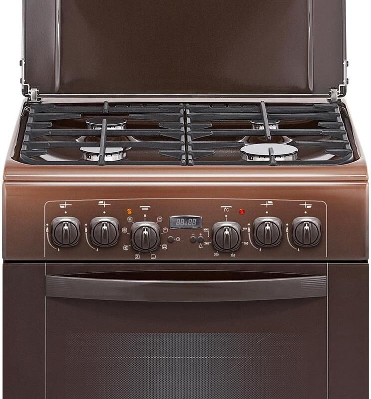 Габариты (ШхГхВ) 60х60х85см.Цвет коричневый. Полезный объем 52л. 4 газ. горелки. Вертел с электроприводом Таймер электронный Выдвижной ящик для посуды и принадлежностей Терморегулятор (термостат) Газ-контроль горелок стола Ускоренный нагрев с конвекцией Гриль электрический Чугунные решетки горелок стола Ножки регулировочные Шашлычница Подсветка духовки двойная Электророзжиг горелок, встроенный в ручки Съемные проволочные направляющие духовки
