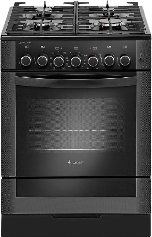 Габариты (ВхШхГ) 85х60х60см. 4 газ. горелки. Духовка электрическая, 52л. Электророзжиг горелок стола, кнопка на панели. Конвекция. Таймер электромеханический. Электрогриль. Турбо-гриль. Вертел с электроприводом. Фасад стеклянный черный с растровым рисунком.