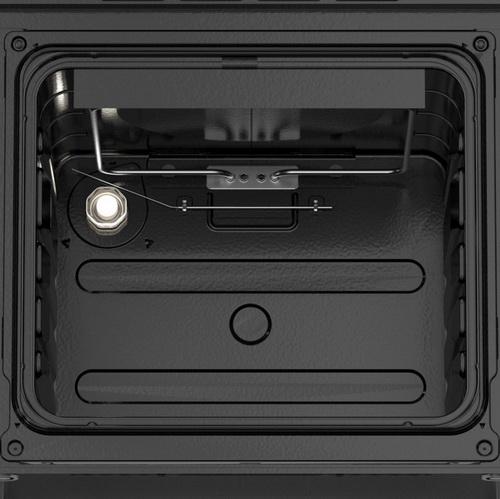 Объем духовки - 50 л. Духовка имеет 3 режима работы, оборудована терморегулятором. 4 пары штампованных направляющих позволяют разместить несколько противней одновременно. В комплекте с плитой прилагается решетка и набор из двух эмалированных поддонов.