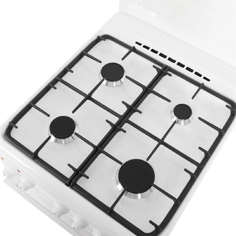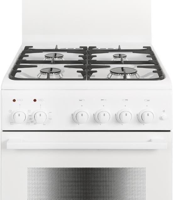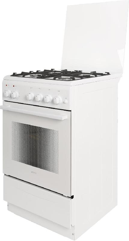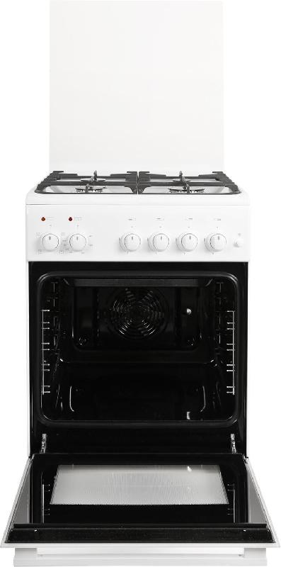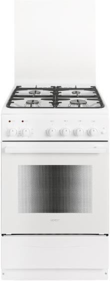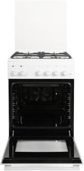 Габариты, ШхГхВ, см: 50x58.5x85; Цвет: белый; Дизайн: классический; Ширина, см: 50; Фасад: эмалированный; Объём духовки, л: 55; Варочная панель: газовая; Решетка варочной панели: чугунная эмалированная; Крышка стола: щиток, стеклянный; Управление варочной панели: кран; Присоединительная резьба газопровода: G 1/2; Номинальная потребляемая мощность электроэнергии, кВт: 1,84-2,02; Тип подключения: газоэлектрический; Количество газовых горелок варочной панели: 4; Газ-контроль горелок стола; Электророзжиг горелок стола: кнопка розжига на панели; Тип направляющих духового шкафа: Съемные проволочные; Количество стекол в дверце духового шкафа: 2; Тип духового шкафа: Электрический: Горелка гриль: электрическая; Ящик для посуды и принадлежностей: С дверцей откидной; Конвекция; Подсветка духовки: одинарная