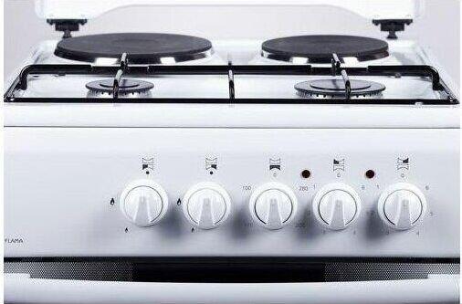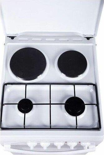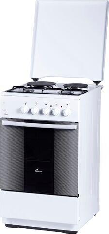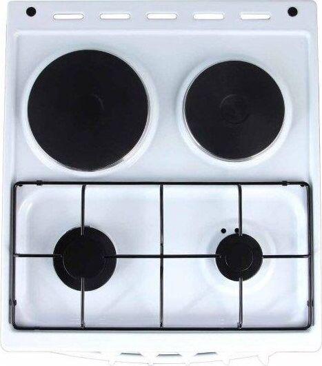 Размеры (ШхГхВ) 50x54х85см, объем духовки 50 л, 4 конфорки, метал. крышка, хоз. отсек, комбинированная (верх-2-газ/2-электро), электрическая духовка, профильная решетка стола, подсветка