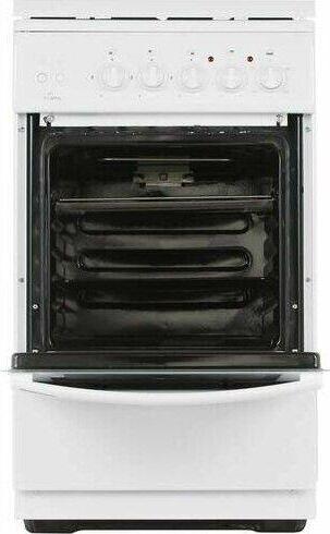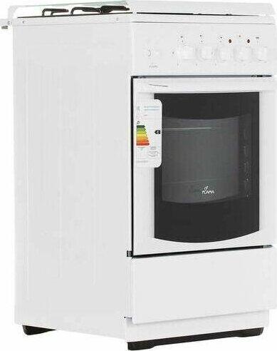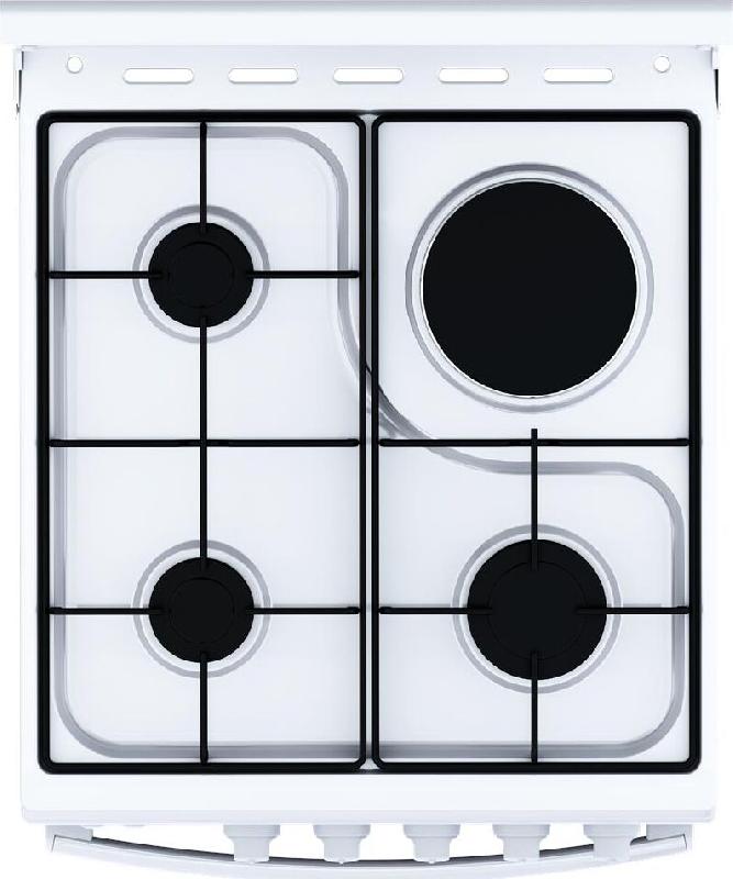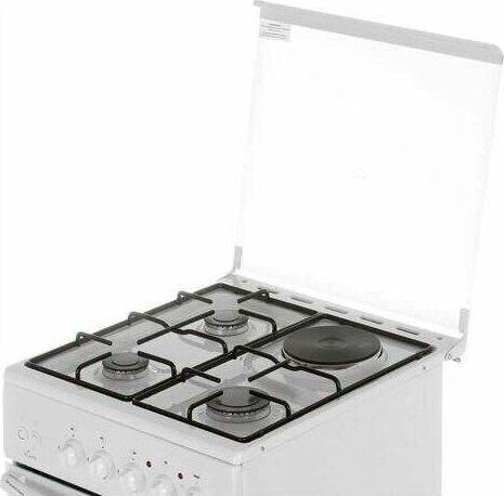 Размеры (ШхГхВ) 50x54х85см, объем духовки 50 л, 4 конфорки, стеклянная крышка, хоз. отсек, комбинированная (верх-3-газ/1-электро), электрическая духовка, профильная решетка, подсветка духового шкафа, электророзжиг стола, еврошарнир