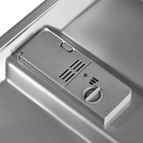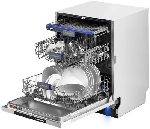 Электронное управление с дисплеем расположено в торце загрузочной дверцы. Функционал данной модели позволяет вам выбрать программу мойки, включить половинную загрузку, выставить время отсрочки старта (1-24 часов).