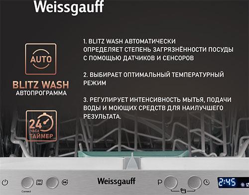 Автопрограмма Blitz Wash поможет вам, в том случае если вы затрудняетесь с выбором программы мойки. Просто выберите авторежим, и посудомоечная машина, с помощью датчиков и сенсоров самостоятельно определит степень загрязненности вашей посуды и выберет оптимальный температурный режим и интенсивность мытья.