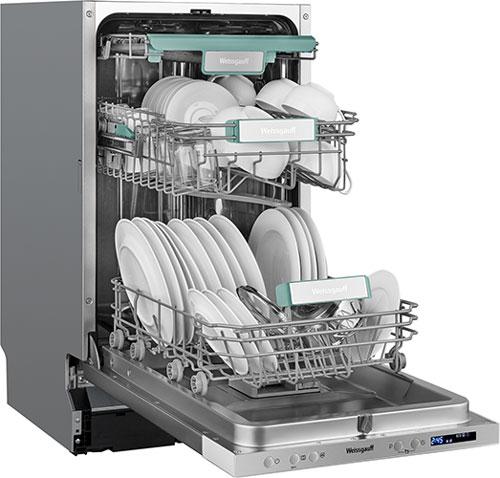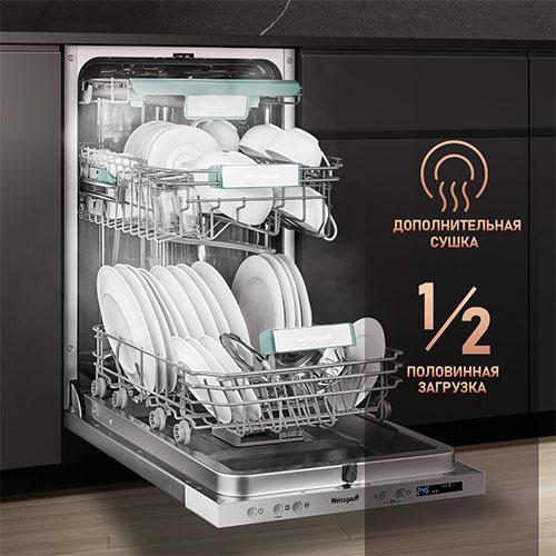 До 10 комплектов посуды одновременно вы можете расположить в данной посудомоечной машине, благодаря современным продуманным и эргономичным корзинам, которыми Weissgauff оснастили эту модель.