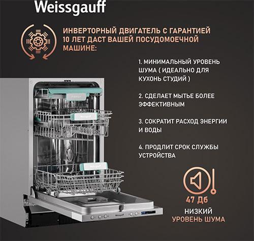 Инверторный двигатель, обеспечивающий более экономичное энергопотребление, пониженный уровень шума и оптимизированный расход воды10 лет гарантии на инверторный двигатель - это живое подтверждение немецкой уверенности Weissgauff в качестве выпускаемой нами продукции!