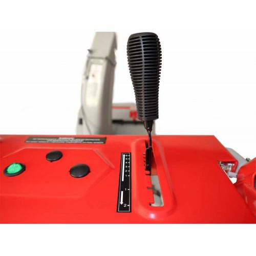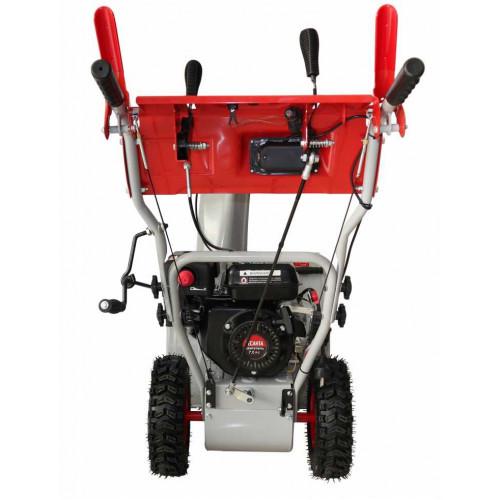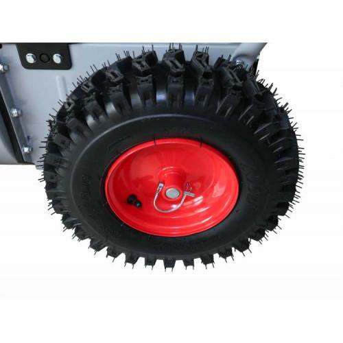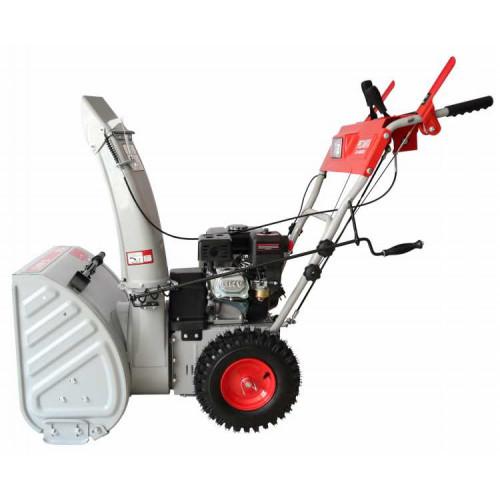 Снегоуборщик работает от 4-тактного двигателя мощностью 7 л. с. Используется воздушное охлаждение. Электростартер от сети 220 В позволяет без проблем запускать технику даже после длительного нахождения на морозе. Самоходный колесный агрегат оснащен фарой, что дает возможность расчищать территорию от снега даже в сумерках. Большие колеса с глубоким протектором обеспечивают хороший контакт с поверхностью.