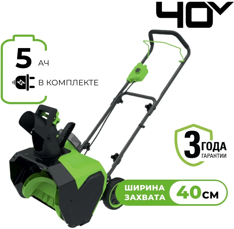| Комплектация | Снегоуборщик аккумуляторный; аккумуляторная батарея 40В 5Ач; зарядное устройство; инструкция; упаковка. |