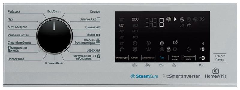 Узкая стиральная машина серебристого цвета имеет максимальную загрузку барабана 7,5 кг, оснащена инверторным мотором ProSmart и нагревательным элементом Hi-Tech с защитой от накипи. 15 программ стиральной машины включают специализированные программы для разных типов тканей, быструю стирку за 14 минут, гипоаллергенную стирку и удаление шерсти животных. Технология SteamCure обрабатывает вещи паром до цикла стирки для лучшего удаления пятен и после отжима для разглаживания тканей. Беспроводное управление HomeWhiz позволяет следить за стиркой и управлять работой стиральной машины с вашего смартфона или планшета.