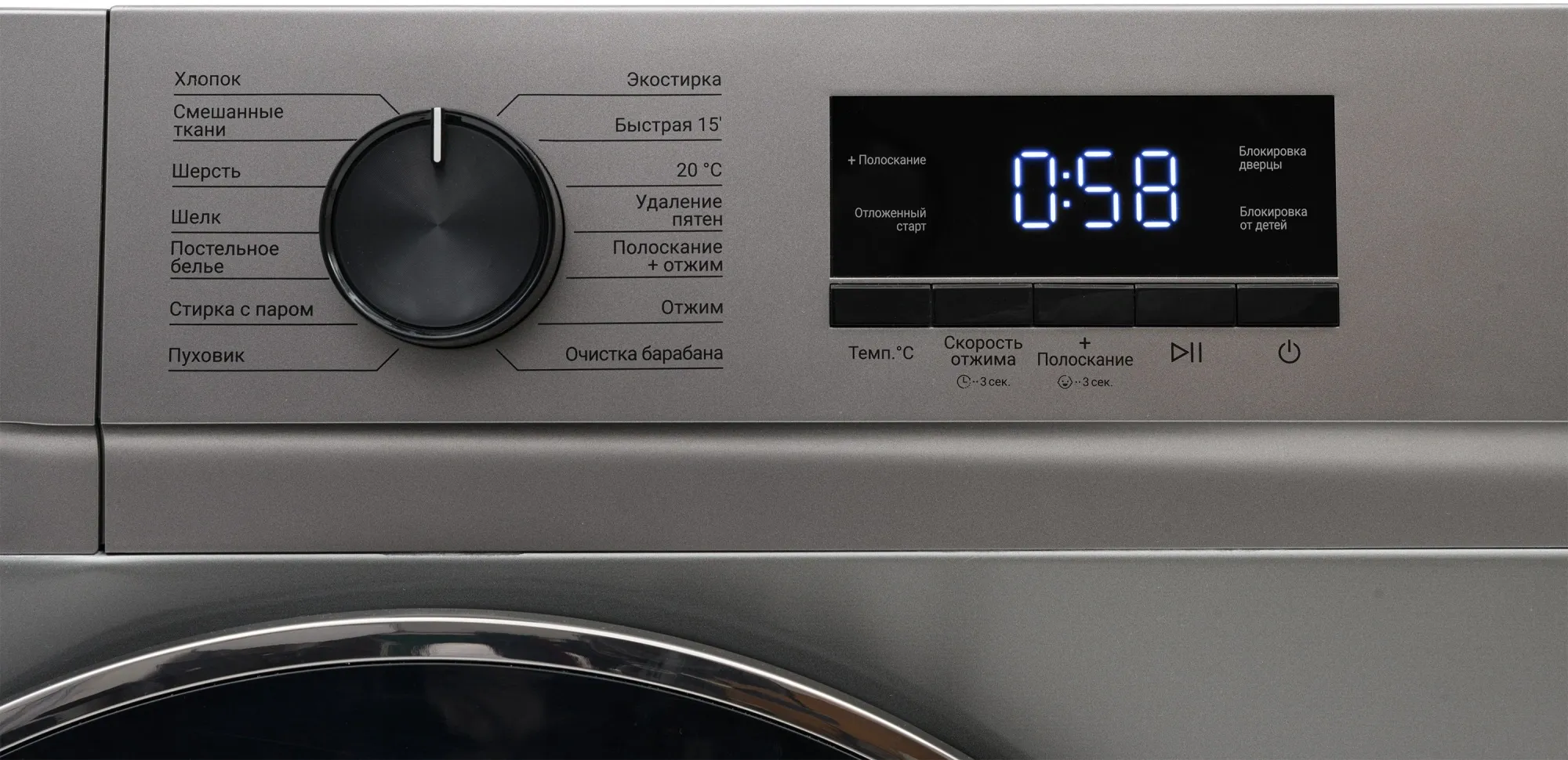 | Программы | Хлопок, Смешанные ткани, Шерсть, Шелк, Постельное бельё, Стирка с паром, Пуховик, Экостирка, Быстрая 15’, 20°C, Удаление пятен, Полоскание + Отжим, Отжим, Очистка барабана |