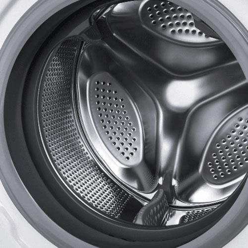 Баран выполнен из нержавеющей стали. Особая форма поверхности барабана бережно отстирывает и не повреждает ткань. Функция автоматической балансировки равномерно распределяет бельё и значительно снижает уровень шума при работе на высоких оборотах.