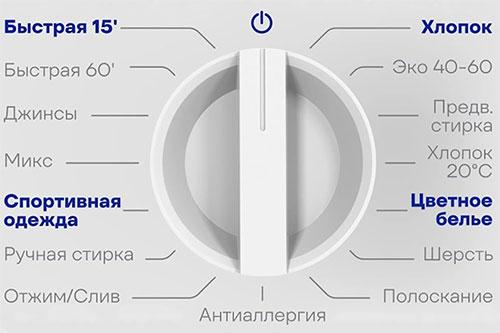 Быстрая'15; Быстрая'60; Хлопок; ЭКО 40-60°C; Хлопок 20°C; Цветное белье; Шерсть; Ручная стирка; Антиаллергия; Спортивная одежда; Микс; Джинсы; Предварительная стирка; Полоскание; Отжим/Слив