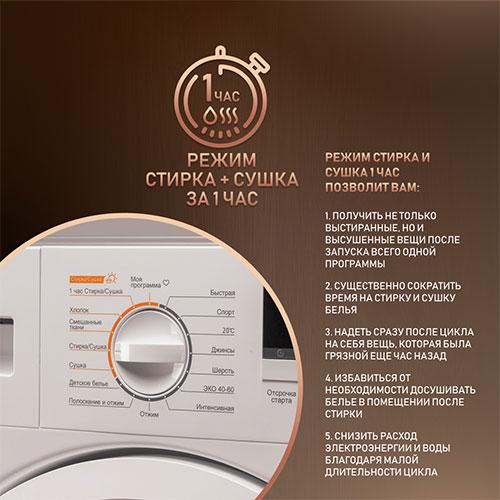 Быстрый режим Стирка + Сушка за 1 час - подходит для ситуаций, когда вам за короткое время необходимо получить чистые и сухие вещи!