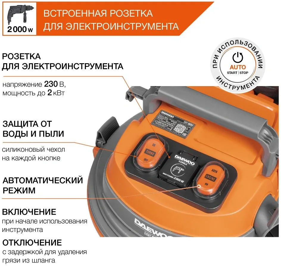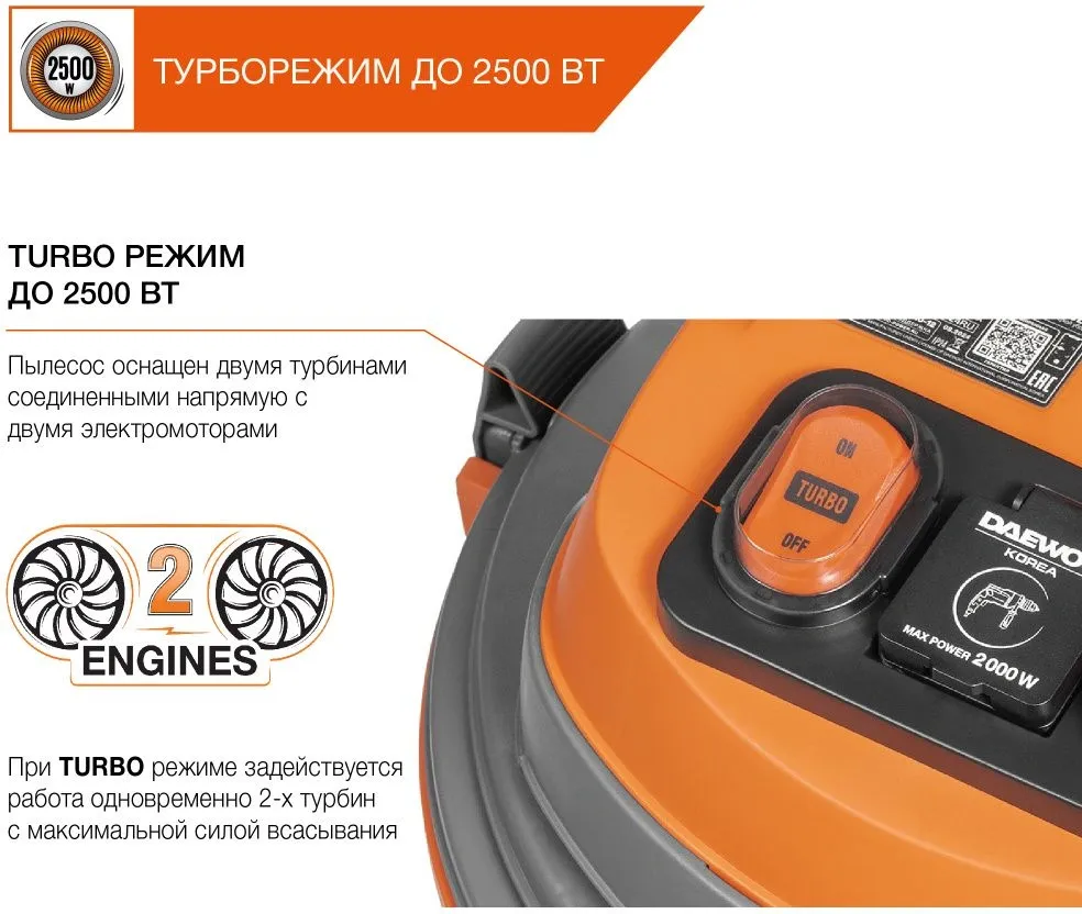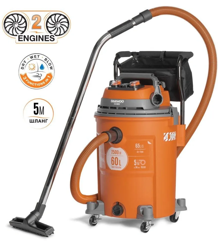 Строительный пылесос Daewoo DAVC 6025S 2500Вт (уборка: сухая/сбор воды/выдув) оранжевый
