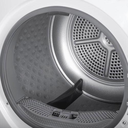 Поверхность барабана выполнена в виде каплевидных ячеек, расположенные в шахматном порядке по поверхности барабана, благодаря такой конструкции между бельем и металлической поверхностью образуется равномерная воздушная подушка, поэтому вещи менее подвержены трениям в процессе сушки. Ребра-активаторы аккуратно переворачивают вещи во время сушки, предотвращая скручивания и смятие тканей.