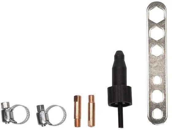 | Комплектация | Штуцер для подключения защитного газа - 8мм Горелка для полуавтоматической сварки MIG 15 - 3м Обратный 25мм2 кабель с зажимом массы - 2.5м Кабель 25мм2 с держателем электрода - 2.5м Ролик подачи с V- |