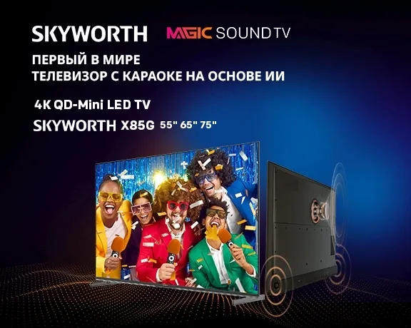 Модель оснащена мощной акустической системой формата 2.1.2 с поддержкой Dolby Atmos и DTS. Встроенный сабвуфер усиливает эффект погружения. Режим AI-Karaoke добавляет развлечений — можно петь любимые песни прямо с телевизора.