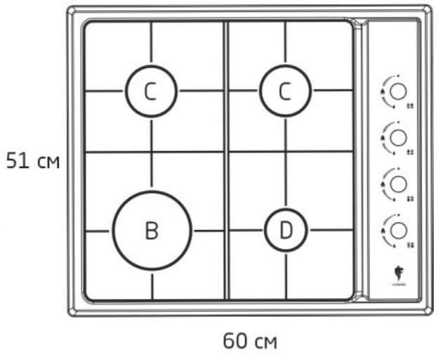 4 горелки Мощность горелок: 3,0/1,75/1,75/1,0 кВт Материал панели сталь Материал решетки эмаль Размер 60*51 см Электроподжиг Мощность электроподжига 1,5 Вт Фиксированное положение "Минимальное пламя" Набор форсунок для баллонного газа Тип газа: природный (метан), сжиженный (пропан-бутан) Давление газа: G20 2000 Па (20 мбар) Вес 7,35 кг Длина шнура 0,8 м Напряжение 220-240В,50-60Гц Гарантия 2 года