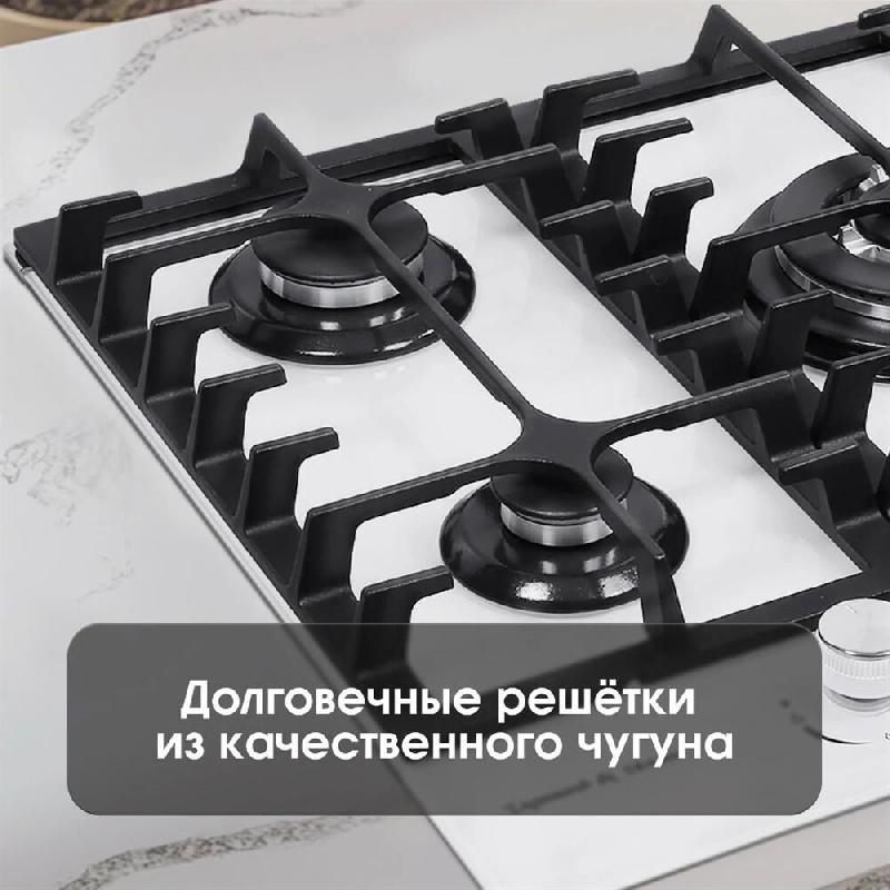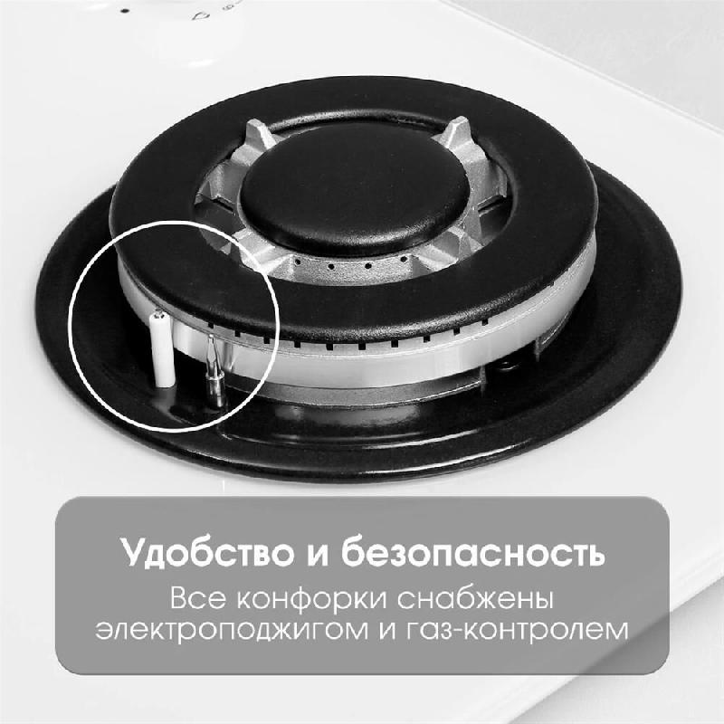 | Особенности | чугунные решетки, газ-контроль, тройной ряд пламени конфорки, электроподжиг в поворотной ручке |