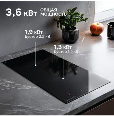 Стеклокерамическая варочная панель (индукция). 2 конфорки. Управление сенсорное. Общая мощность: 3600 Вт. Бустер на каждую зону нагрева. Инвертор. Индикация остаточного тепла. Блокировка клавиатуры. Защита от перегрева. Автоотключение при длительном использовании. Автоматическое определение размера посуды и регулировка мощности. Таймер на каждую зону. Габариты (ШхГхВ): 288*520*56 мм. Ниша для встраивания (ШхГхВ): 265*495 мм. Длина шнура питания 865 мм. Цвет: Черный
