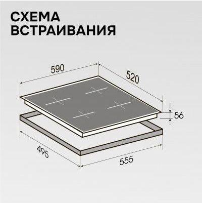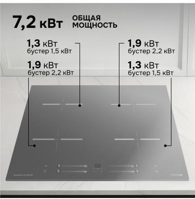 Стеклокерамическая варочная панель (индукция). 4 конфорки. Управление мультислайдер. Общая мощность: 7200 Вт. Бустер на каждую зону нагрева. Инвертор. Индикация остаточного тепла. Блокировка клавиатуры. Защита от перегрева. Автоотключение при длительном использовании. Автоматическое определение размера посуды и регулировка мощности. Таймер на каждую зону. Габариты (ШхГхВ): 590*520*56 мм. Ниша для встраивания (ШхГхВ): 555*495 мм. Длина шнура питания 885 мм. Цвет: Графит