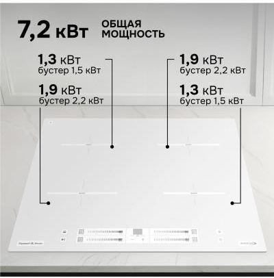 Стеклокерамическая варочная панель (индукция). 4 конфорки. Управление мультислайдер. Общая мощность: 7200 Вт. Бустер на каждую зону нагрева. Инвертор. Индикация остаточного тепла. Блокировка клавиатуры. Защита от перегрева. Автоотключение при длительном использовании. Автоматическое определение размера посуды и регулировка мощности. Таймер на каждую зону. Габариты (ШхГхВ): 590*520*56 мм. Ниша для встраивания (ШхГхВ): 555*495 мм. Длина шнура питания 885 мм. Цвет: Белый