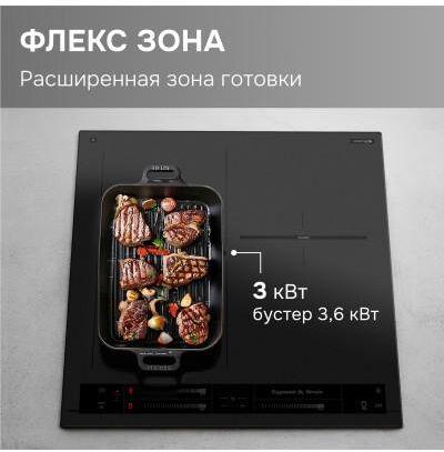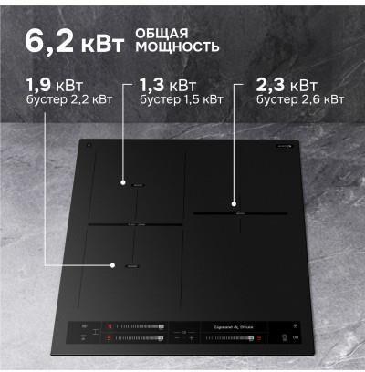Стеклокерамическая варочная панель (индукция). 3 конфорки. Управление мультислайдер. Общая мощность: 6200 Вт. Бустер на каждую зону нагрева. Инвертор. Индикация остаточного тепла. Блокировка клавиатуры. Защита от перегрева. Автоотключение при длительном использовании. Автоматическое определение размера посуды и регулировка мощности. Таймер на каждую зону. Габариты (ШхГхВ): 450*520*56 мм. Ниша для встраивания (ШхГхВ): 430*495 мм. Длина шнура питания 880 мм. Цвет: Черный