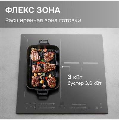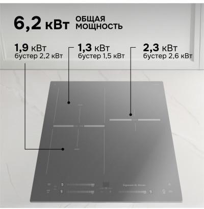 Стеклокерамическая варочная панель (индукция). 3 конфорки. Управление мультислайдер. Общая мощность: 6200 Вт. Бустер на каждую зону нагрева. Инвертор. Индикация остаточного тепла. Блокировка клавиатуры. Защита от перегрева. Автоотключение при длительном использовании. Автоматическое определение размера посуды и регулировка мощности. Таймер на каждую зону. Габариты (ШхГхВ): 450*520*56 мм. Ниша для встраивания (ШхГхВ): 430*495 мм. Длина шнура питания 880 мм. Цвет: Графит