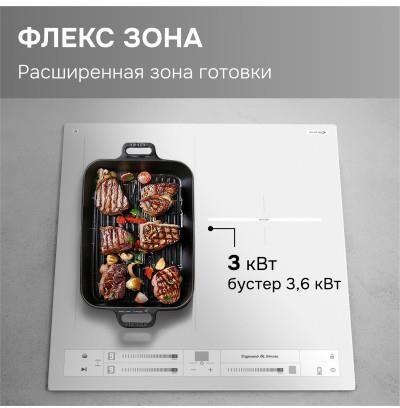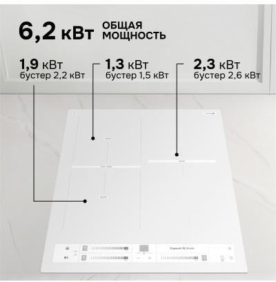Стеклокерамическая варочная панель (индукция). 3 конфорки. Управление мультислайдер. Общая мощность: 6200 Вт. Бустер на каждую зону нагрева. Инвертор. Индикация остаточного тепла. Блокировка клавиатуры. Защита от перегрева. Автоотключение при длительном использовании. Автоматическое определение размера посуды и регулировка мощности. Таймер на каждую зону. Габариты (ШхГхВ): 450*520*56 мм. Ниша для встраивания (ШхГхВ): 430*495 мм. Длина шнура питания 880 мм. Цвет: Белый