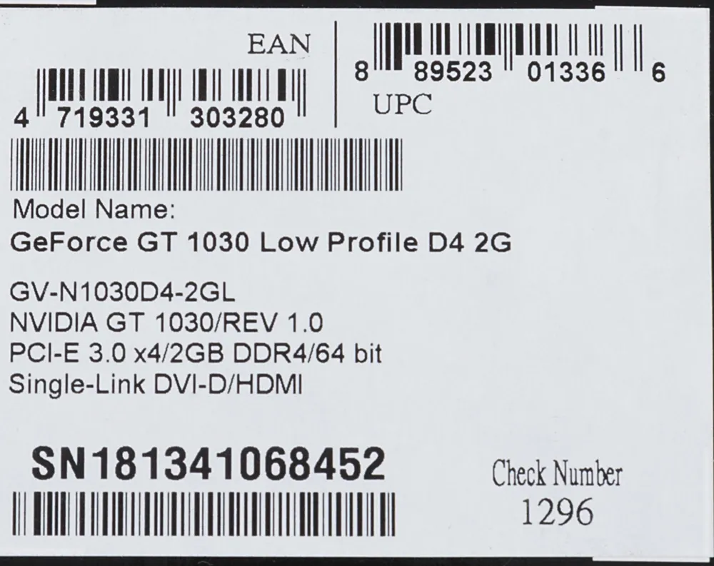 Видеокарта Gigabyte PCI-E 3.0 GV-N1030D4-2GL NVIDIA GeForce GT 1030 2Gb 64bit DDR4 1177/2100 DVIx1 HDMIx1 HDCP Ret low profile