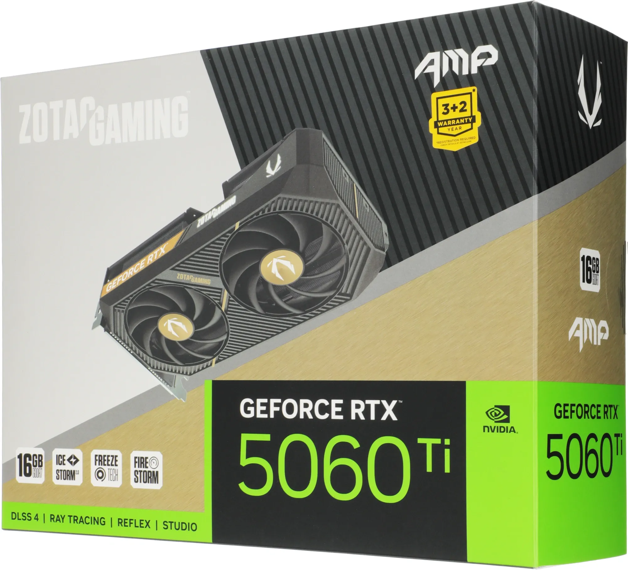 Видеокарта Zotac PCI-E 5.0 RTX 5060TI 16GB AMP NVIDIA GeForce RTX 5060TI 16Gb 128bit GDDR7 2632/28000 HDMIx1 DPx3 HDCP Ret