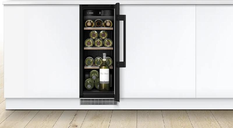 Винный шкаф Bosch KUW20VHF0 из серии Serie 6 представляет собой элегантное и функциональное решение для хранения вина. Эта модель выполнена в строгом черном цвете, что делает ее универсальной и подходящей для любого интерьера. Прозрачная стеклянная дверь обеспечивает удобный обзор содержимого шкафа, а также защищает вино от вредного воздействия ультрафиолетовых лучей. Управление шкафом осуществляется при помощи сенсорных элементов и удобного дисплея. Пользователь может легко настроить температуру в диапазоне от 5 до 20 градусов цельсия, что позволяет создать оптимальные условия для различных видов вина.