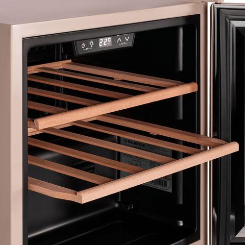 Дерево – эстетика и сохранность вина. Винный шкаф оснащен деревянными полками, что является лучшим выбором для хранения вина. Такие полки снижают возможную вибрацию, положительно влияя на качество вина, и уменьшают шум во время эксплуатации.