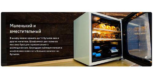Внутреннее пространство рассчитано на хранение до 14 бутылок. При желании можно извлечь полку и разместить большее количество бутылок.