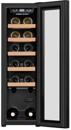 Внутреннее пространство рассчитано на хранение до 12 бутылок. При желании можно извлечь полку и разместить большее количество бутылок.