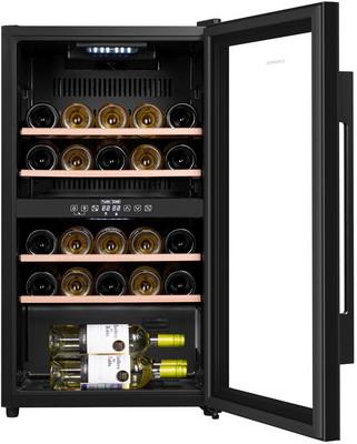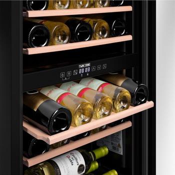 | Особенности | Шкаф имеет две зоны, для каждой из них можно задать свой режим охлаждения — это актуально для тех, кто планирует хранить дома разные виды напитка: красное, белое, шампанское. |