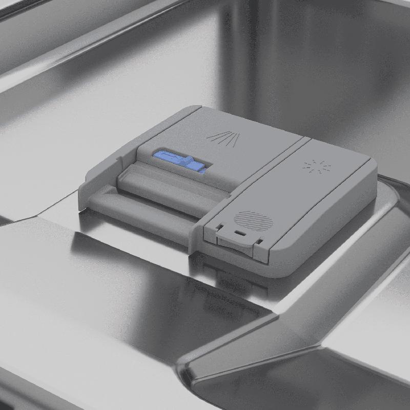 В машине можно мыть тонкое стекло, есть зона интенсивной очистки и функция усиленной гигиены. Защиту от протечек обеспечивает система WaterSafe+, активирующая автоматическое отключение. За управление отвечает сенсорно-механическая панель с LCD-экраном. Время до окончания процесса отображается на полу с помощью светового луча. В комплект включена воронка для засыпания соли.