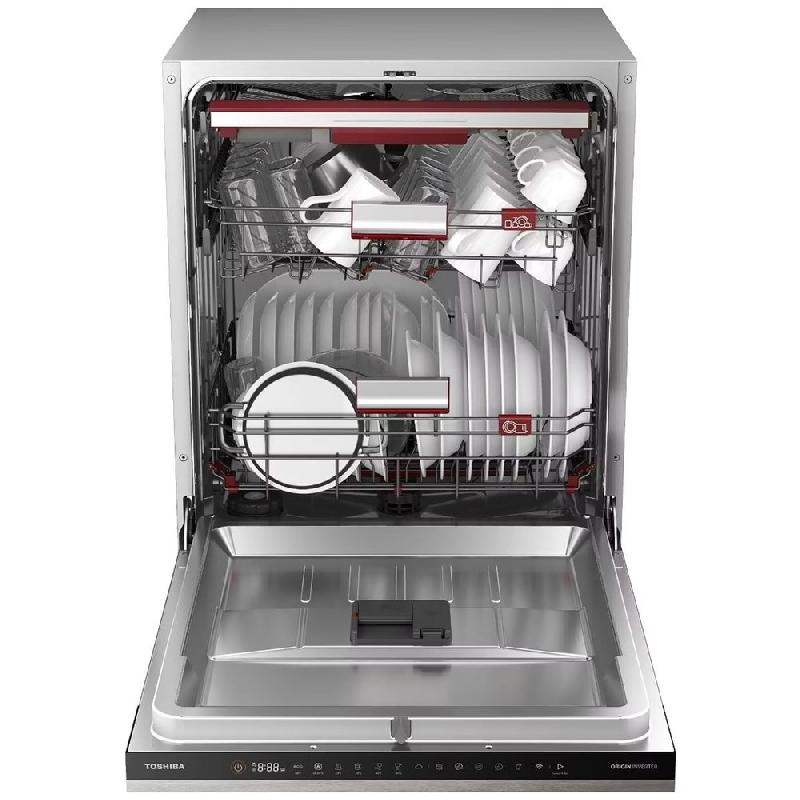 Toshiba DW-14B4(B)-RU поддерживает использование универсальных моющих средств типа «3 в 1». Таймер отложенного старта можно запрограммировать сроком до суток. О завершении процесса сообщает звуковой сигнал. Время до окончания мойки дополнительно отображается лучом на полу. В камере установлено освещение, в комплект входят воронка для засыпания соли и корзина для столовых приборов.