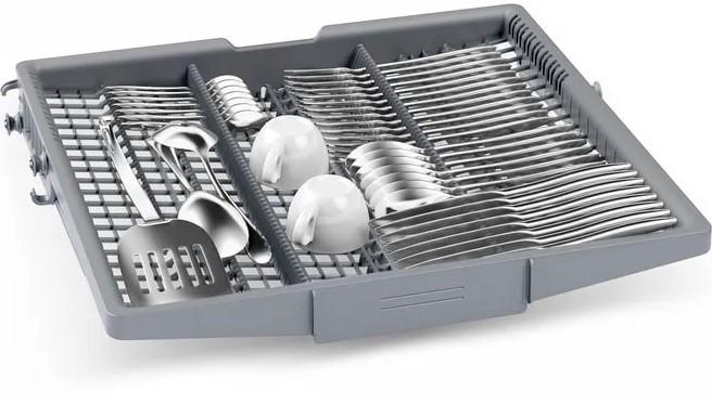 Встраиваемая посудомоечная машина Bosch SBH4HVX00E сочетает аккуратный внешний вид и продуманные инженерные решения, позволяющие превращать ежедневный ритуал в тихую и экономичную процедуру. Стальная панель управления из нержавеющей стали визуально подчёркивает статусность техники и обеспечивает устойчивость к износу, а закрытая панель сохраняет цельность кухонного фасада, делая прибор гармоничным элементом интерьера без лишних деталей на виду. Компактные пропорции при полноразмерном объёме загрузки позволяют разместить до 14 комплектов одновременно, что особенно удобно для больших семей или тех, кто предпочитает реже запускать цикл. Внутренняя компоновка выполнена с акцентом на гибкость: три корзины с регулируемой по высоте верхней секцией Rackmatic-3 и двумя полочками для чашек дают возможность быстро адаптировать пространство под посуду разного формата, а складные направляющие для тарелок в верхнем и нижнем отделениях упрощают укладку кастрюль или высоких бокалов.