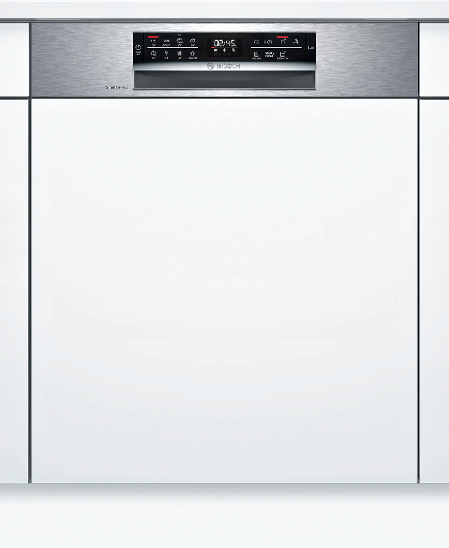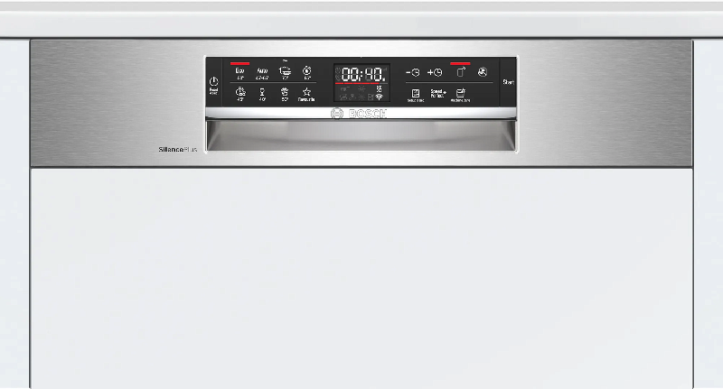Управление машиной осуществляется с помощью сенсорных кнопок на открытой панели управления, на которой также расположен дисплей. Модель поддерживает функцию Home Connect, что позволяет управлять ею дистанционно через смартфон или планшет. Также есть индикаторы наличия ополаскивателя, соли и времени до окончания программы, а также таймер отсрочки запуска от 1 до 24 часов.
