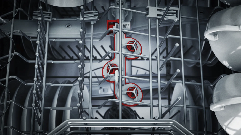 Внутренний резервуар машины выполнен из нержавеющей стали и пластика, что гарантирует его долговечность и легкую очистку. Модель оснащена тремя корзинами, верхняя из которых переставляемая по высоте с системой Rackmatic-3. Это обеспечивает максимальное удобство при загрузке посуды разных размеров.