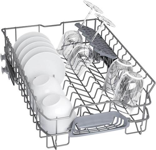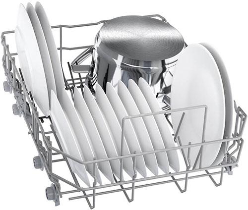 Посудомоечная машина Bosch SPV4EMX10E — узкая модель, которая рассчитана на единовременную обработку до десяти комплектов посуды. Прибор встраивается в нишу размером 81,5-87,5х45х55 см. Регулируемые задние ножки помогут нивелировать неровности пола.