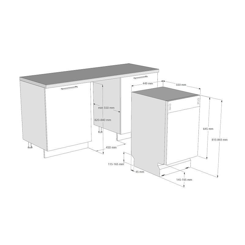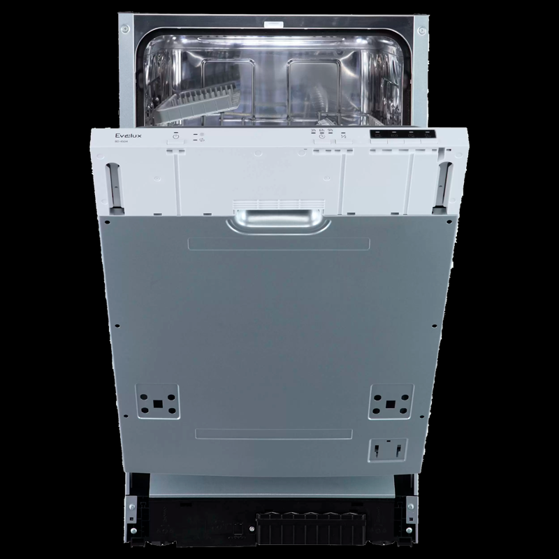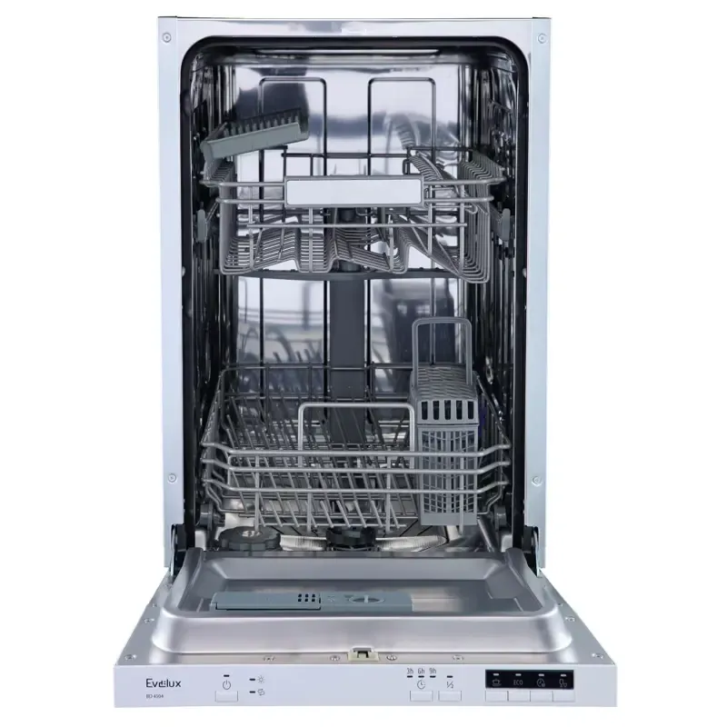 Встраиваемая посудомоечная машина Evelux, 45 см, 8 комплектов, 4 программы, 2 корзины, переносная корзина для столовых приборов, регулировка корзины по высоте, электронное управление, LED индикаторы, звуковая индикация, половинная загрузка, двигатель коллекторный, энергоэффективность А++, уровень шума 49 дБ